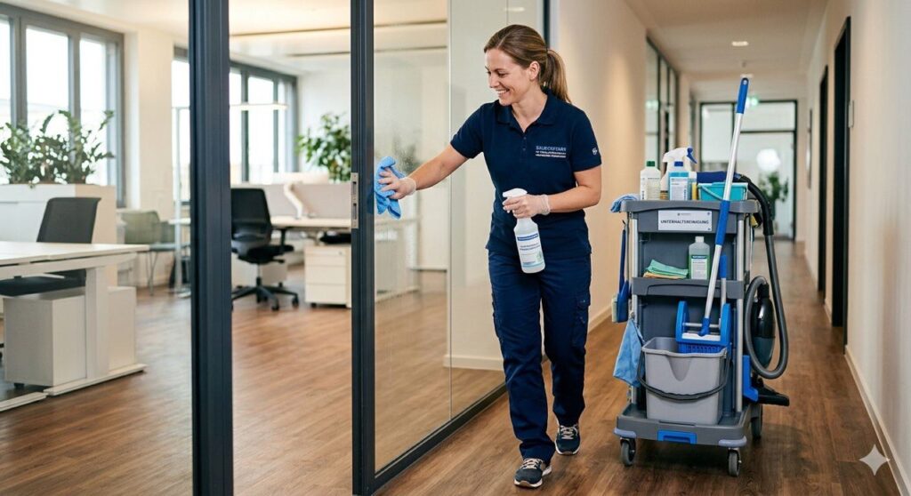 Professionell ausgebildete Reinigungskräfte mit Erfahrung in Büro- und Gebäudereinigung.